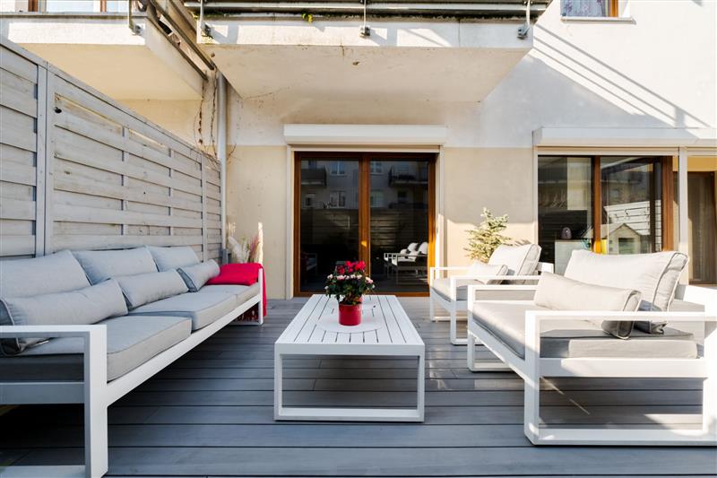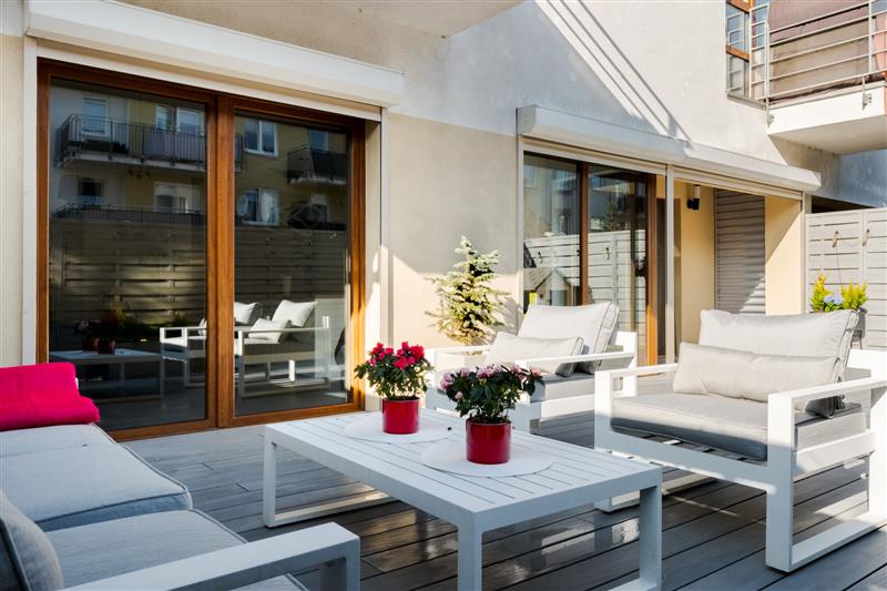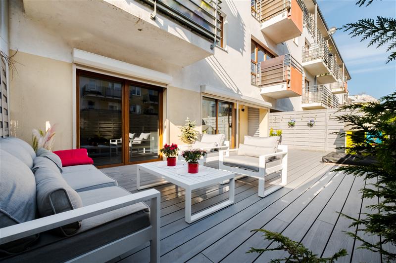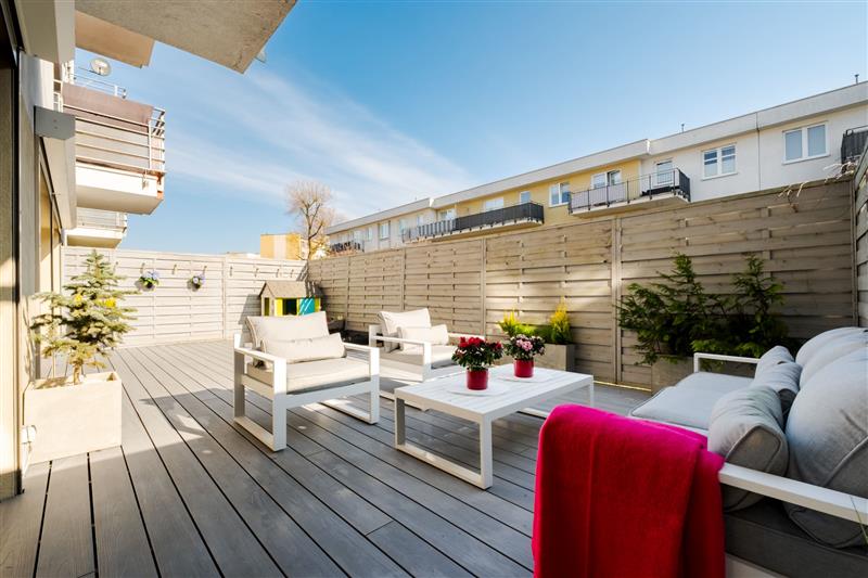 Taras to przedłużenie strefy wypoczynku i relaksu- znajdują się w nim meble wypoczynkowe (ogrodowe) oraz ozdobne krzewy i kwiaty, na podłodze znajduje się deska kompozytowa odporna na warunki atmosferyczne.