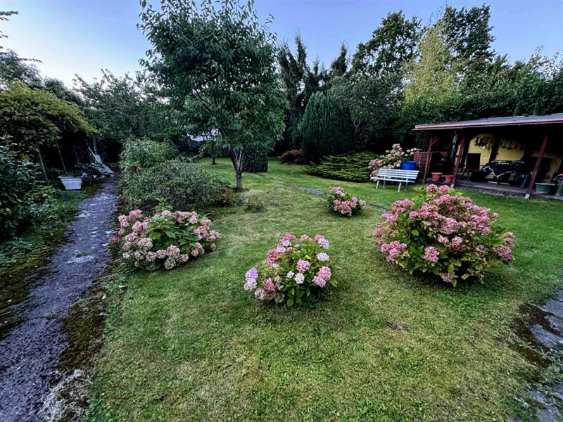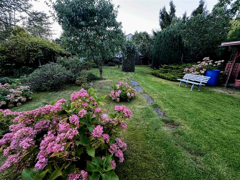 Z tyłu domu rozciąga się piękny, zadbany ogród z licznymi nasadzeniami:
