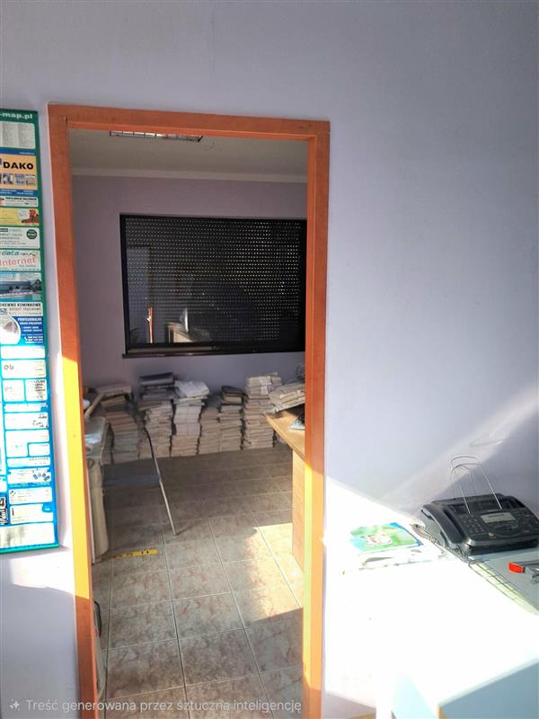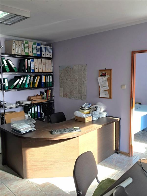 Na działce posadowiony jest również budynek parterowy administracyjny( sprzedawana jest połowa budynku ), o pow. 37,35m2. W pawilonie mieszczą się pomieszczenia biurowe, sanitariat i aneks kuchenny. Okna PCV, 2 x wc, 2 x biuro, przedsionek