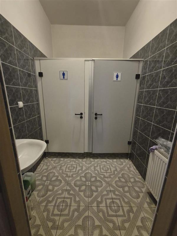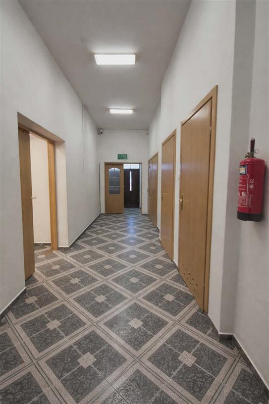 Przyziemie składa się z długiego korytarza, osobnego biura, pom. gospodarczego z kotłownią, szatni z aneksem kuchennym dla pracowników, osobne toalety - damska i męska oraz po prawej części duża sala - otwarta przestrzeń z oknami stanowiąca obecnie część użytkową na usługi. wys.3,20m.