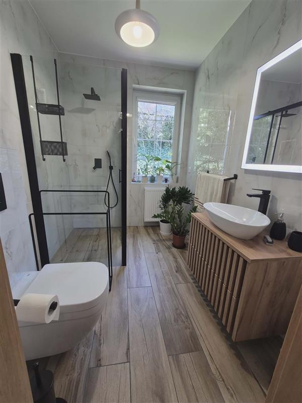 Ogrzewanie na piec gazowy Saunier Duval, w części usługowej hydrofor, siła, okna dwuszybowe, dom ocieplony styropianem -12cm, wybudowany metodą tradycyjną z pustaków ceramicznych Wienerberger, na dachu dachówka cementowa. Na dachu zamontowane zostały panele fotowoltaiczne 10 kW. Monitoring, alarm, klimatyzacja.