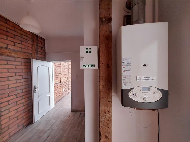 Ogrzewanie z pieca c.o. na gaz, lokal wyposażony w instalacje wodno-kanalizacyjną i elektryczną.