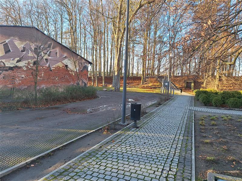 Teren wokół budynku zagospodarowany z oświetleniem, śmietnikami, stojakiem na rowery i zielenią ozdobną. Za budynkiem jest miejsce gdzie można zaparkować kilka samochodów.