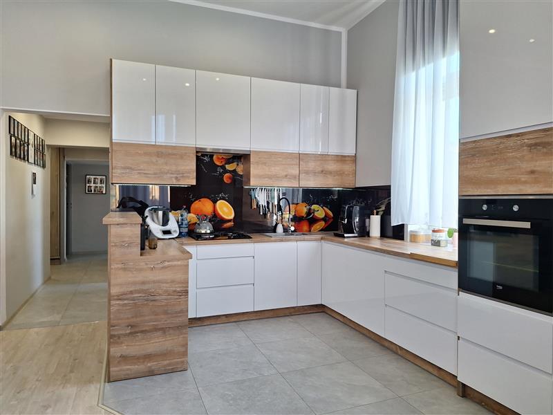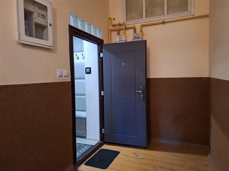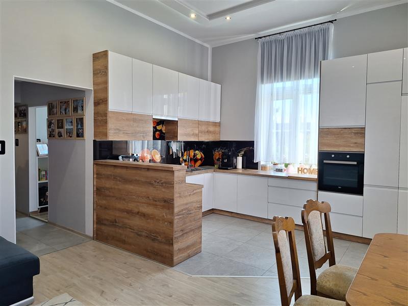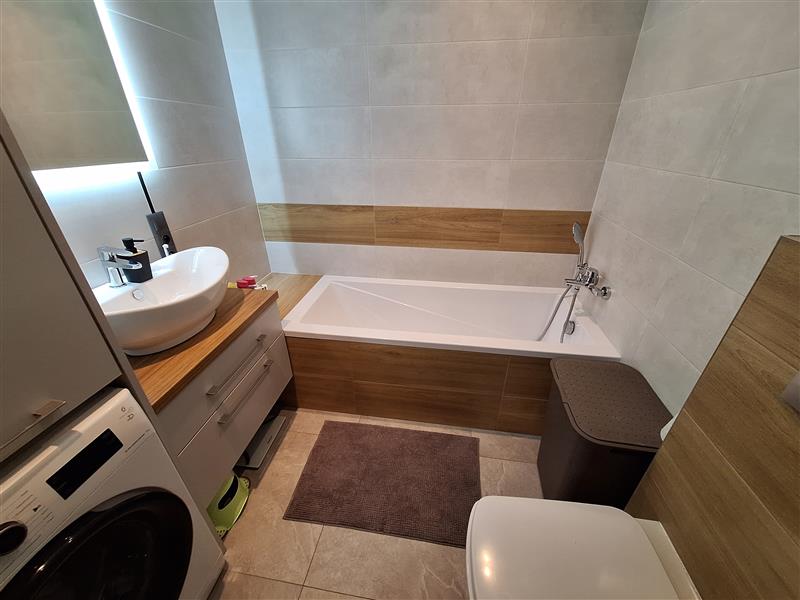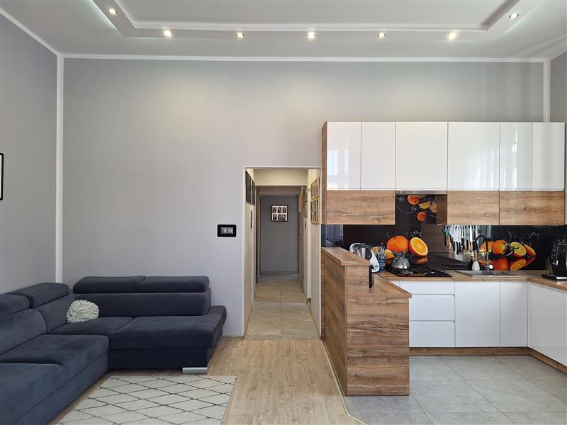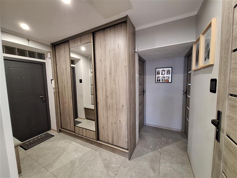 Mieszkanie rozkładowe, doświetlone od dwóch stron świata. Najważniejszym pomieszczeniem jest przestronny salon doświetlony wysokimi oknami wypukłego ryzalitu, z podwieszanym sufitem o sterowanym oświetleniu. W centralnym miejscu mieści się rozkładany stół jadalniany. Po lewej stronie pomieszczenia, znajduje się starannie dopasowana kuchnia z niewielkim barkiem w kolorach bieli i drewna. W lokalu są trzy sypialnie (główna sypialnia z podwójnym łóżkiem, pokój dziecięcy, oraz pokój gościnny doświetlony pośrednio. Z korytarza jest wejście do łazienki z wanną, oraz oddzielnego WC z prysznicem. Mieszkanie po remoncie w pełni wyposażone nowymi meblami i sprzętem.
