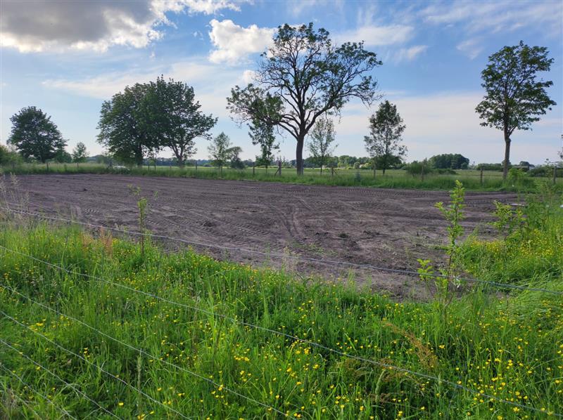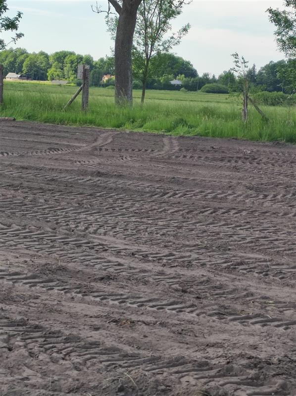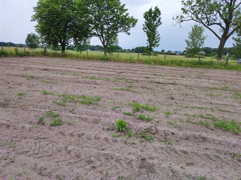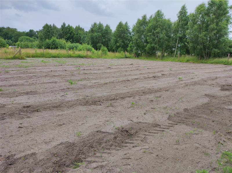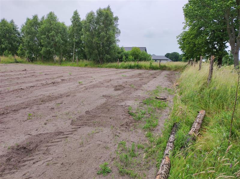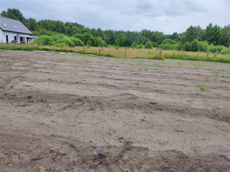 Prąd i woda na granicy działki. Teren płaski i suchy, w całości ogrodzony siatką leśną. Znajdują się na nim nasadzenia: grusza, czereśnia, śliwa i jabłoń.