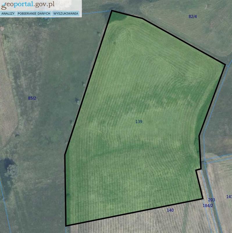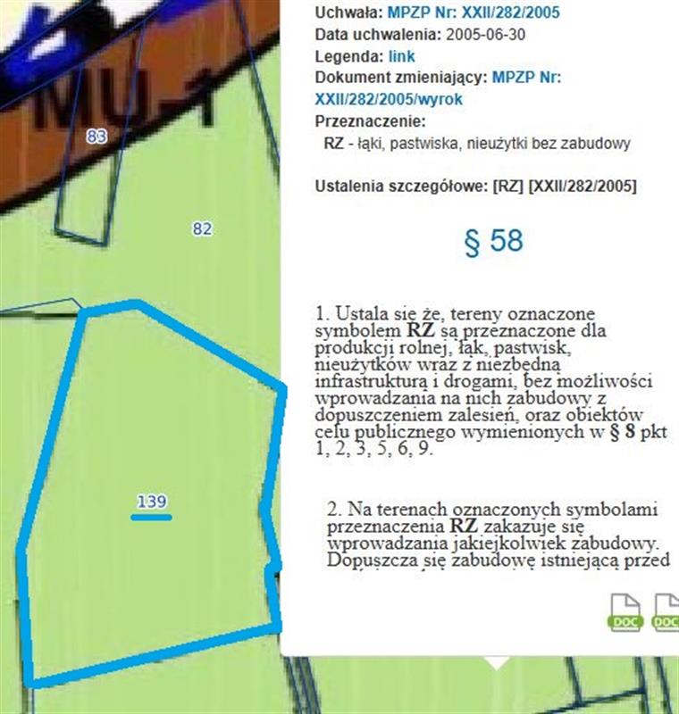 Zagospodarowanie przestrzenne: Zgodnie z obowiązującym planem zagospodarowania przestrzennego uchwalonym w 2005 roku, działka w całości znajduje się na terenach oznaczonych symbolem "RZ" - ustala się że, tereny oznaczone symbolem RZ są przeznaczone dla produkcji rolnej, łąk, pastwisk, nieużytków wraz z niezbędną infrastrukturą i drogami, bez możliwości wprowadzania na nich zabudowy. W ewidencji gruntów, zgodnie z bonitacyjną klasyfikacją gleb, są to w większości łąki IV klasy - "ŁIV", oraz częściowo grunty orne klasy piątej - "RV".