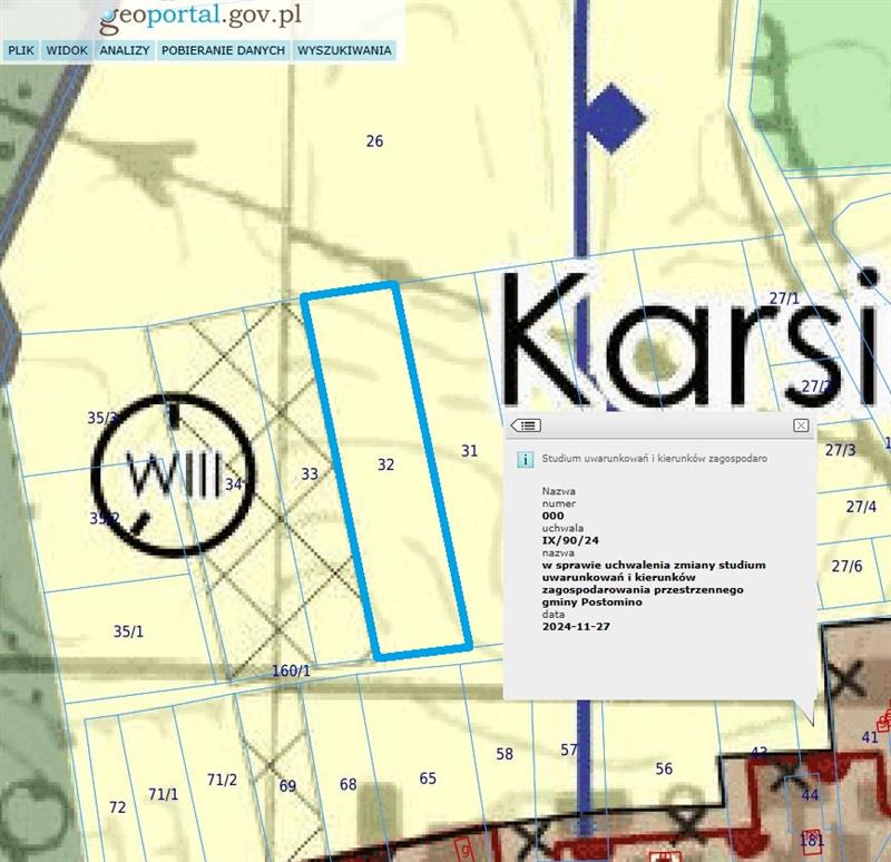 Dla terenu działki brak jest obowiązującego planu zagospodarowania przestrzennego. W ewidencji gruntów ziemia oznaczona jako grunty orne klasy RIVa.