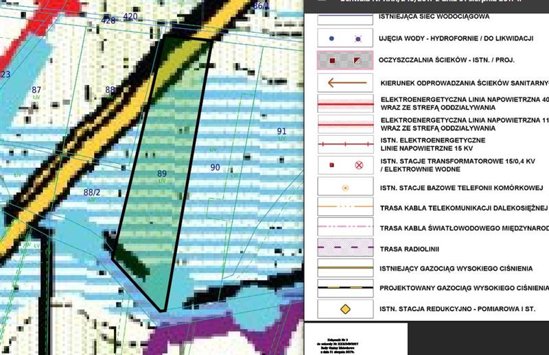 Przez północno zachodni narożnik działki, przebiega gazociąg, z tego też względu jest ona częściowo objęta planem zagospodarowania przestrzennego (TT - tereny techniczne). W studium zagospodarowania przestrzennego gminy, są to tereny rolne o niskiej przydatności rolniczej, narażone na niebezpieczeństwo powodzi.