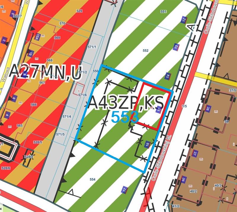Zgodnie z Miejscowym Planem Zagospodarowania Przestrzennego, dopuszcza się zachowanie istniejących obiektów usługowych oraz mieszkalnych. Działka znajduje się na terenie oznaczonym A43ZP,KS opisanym jako "tereny zieleni urządzonej i tereny urządzeń komunikacyjnych, o minimalnym udziale powierzchni biologicznie czynnej: 50%.