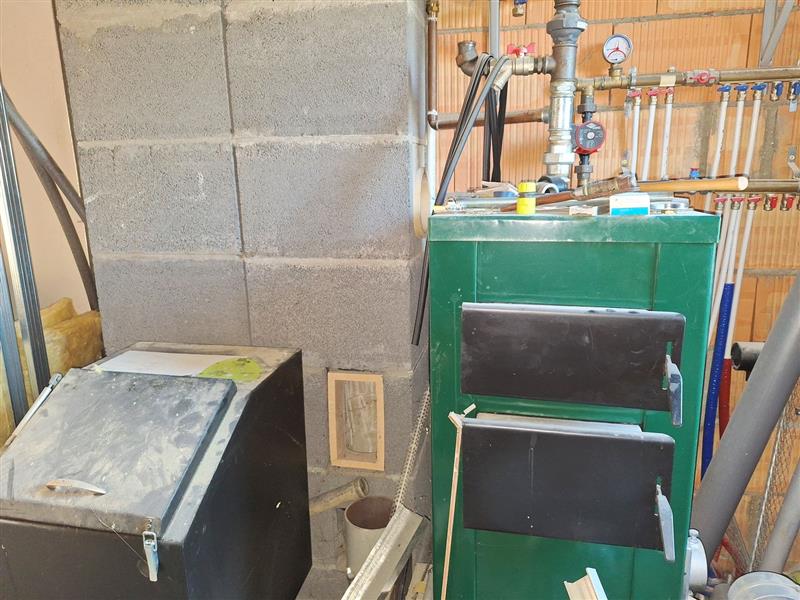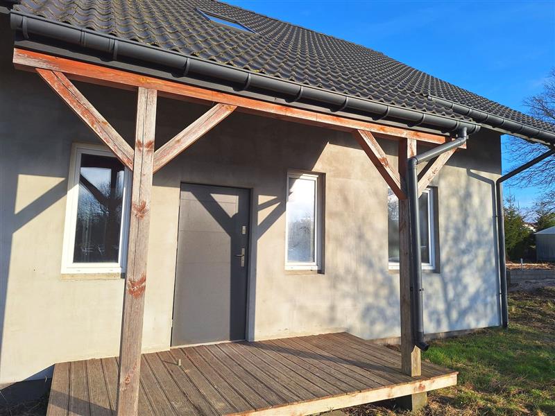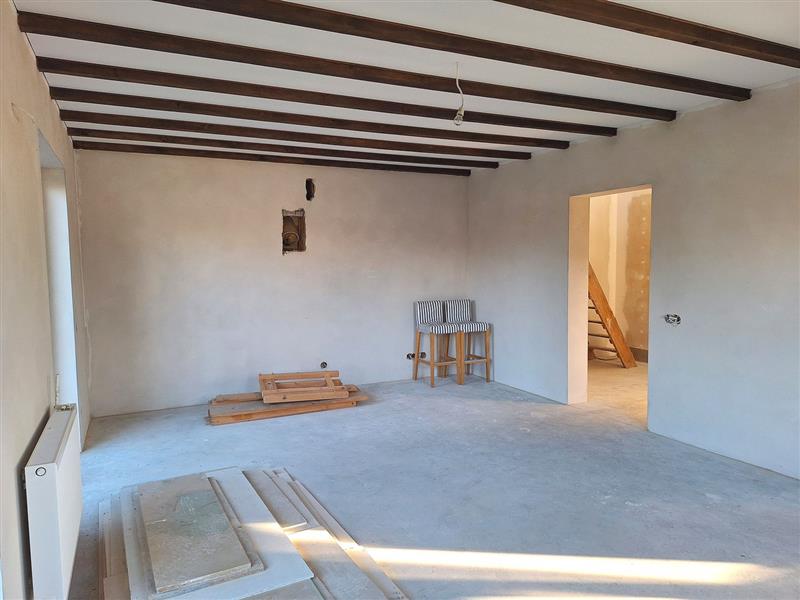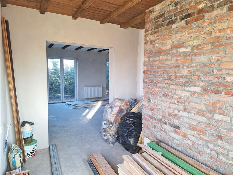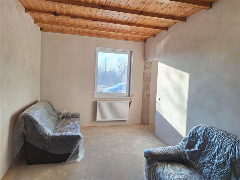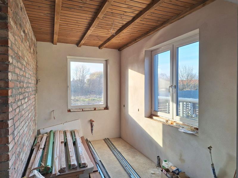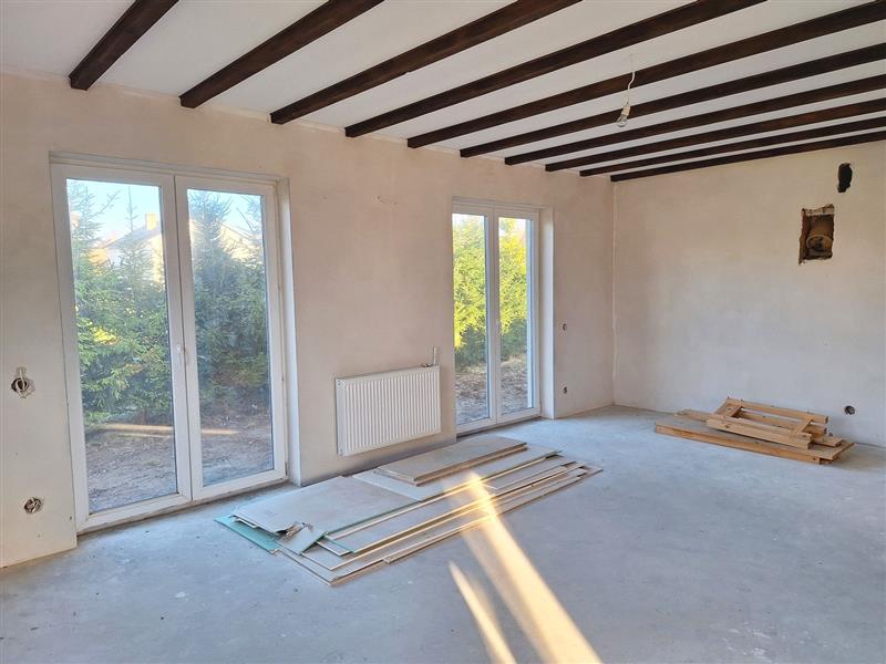 Wykończenie obejmuje: wylane posadzki na parterze, podłogi z płyt na piętrzetynki cementowo–wapiennezabudowy z profili aluminiowych i płyt g-k drewnianą podbitkę na sufitach kuchni i dodatkowego pomieszczeniaozdobne belki sufitowe w salonieprzygotowane instalacje wodne i elektryczne - do dokończenia podpięcie instalacji wodnej, zamontowanie i podłączenie rozdzielnicyrozprowadzone punkty świetlne i gniazdazamontowane grzejniki (do podłączenia)wstawiony kocioł na opał staływłaściciel pozostawia zakupione materiały wykończeniowe, m.in. komplet ościeżnic i drzwi, pozostałe profile aluminiowe i deski tarasowe