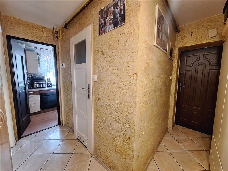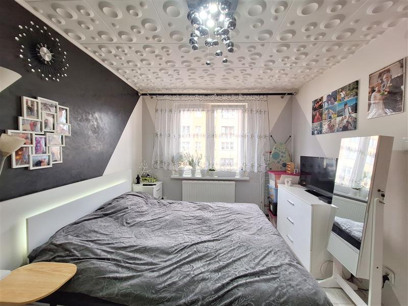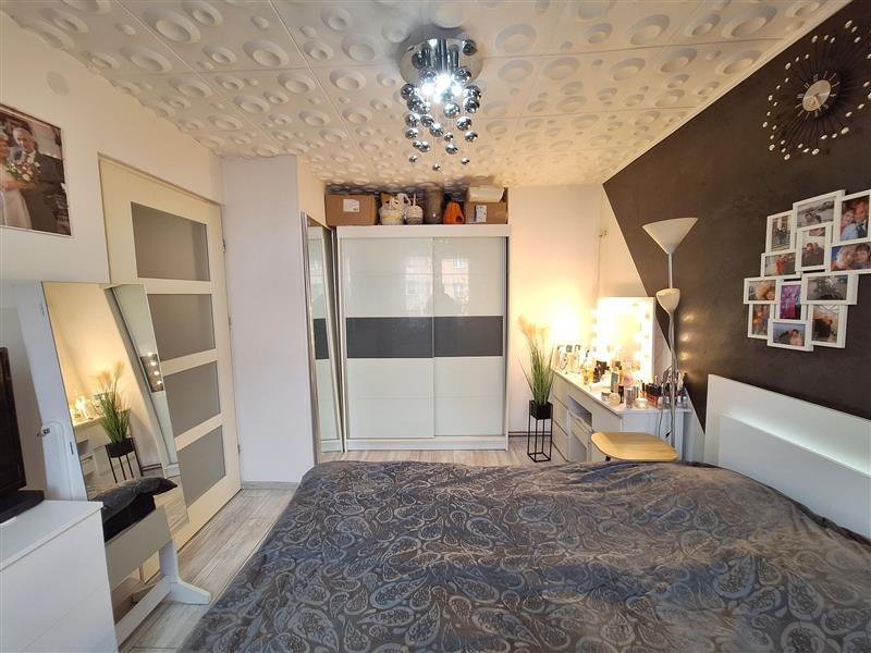 Wnętrze zostało wykończone w neutralnym stylu, w salonie i sypialni położono panele, w kuchni i korytarzu płytki, ściany zostały odmalowane, a mieszkanie wyposażono w meble oraz pojemne szafy z drzwiami przesuwnymi. Lokal sprzedawany jest z umeblowaniem, dzięki czemu może być gotowy do zamieszkania bez dodatkowych nakładów.