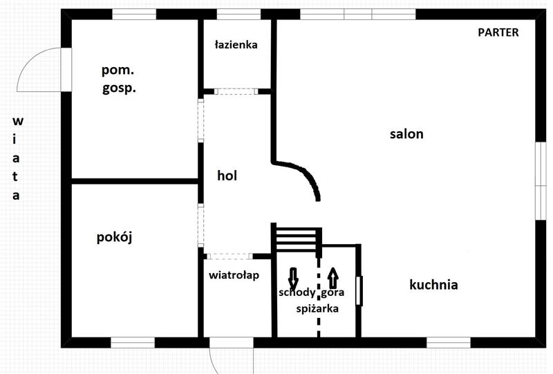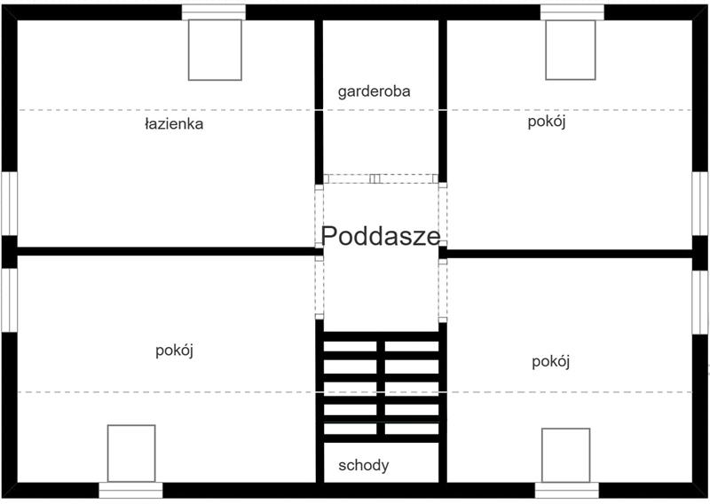 Układ pomieszczeń jest funkcjonalny i dobrze przemyślany. Na parterze znajduje się przestronny salon z aneksem kuchennym i spiżarnią, dodatkowy pokój zlokalizowany przy wejściu (idealny jako gabinet lub pokój gościnny), łazienka z prysznicem oraz pomieszczenie gospodarcze z osobnym wejściem od strony wiaty. Na piętro prowadzą betonowe schody przygotowane do własnej aranżacji. Znajdują się tam trzy wygodne sypialnie, garderoba oraz duże pomieszczenie w stanie surowym, zaprojektowane jako druga łazienka z możliwością wykonania sauny.